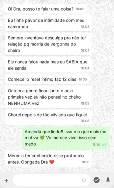 O Reset Íntimo é o protocolo de 7 dias que elimina o odor atacando a causa real. Sem sabonetes, sem antibióticos, sem mascarar.